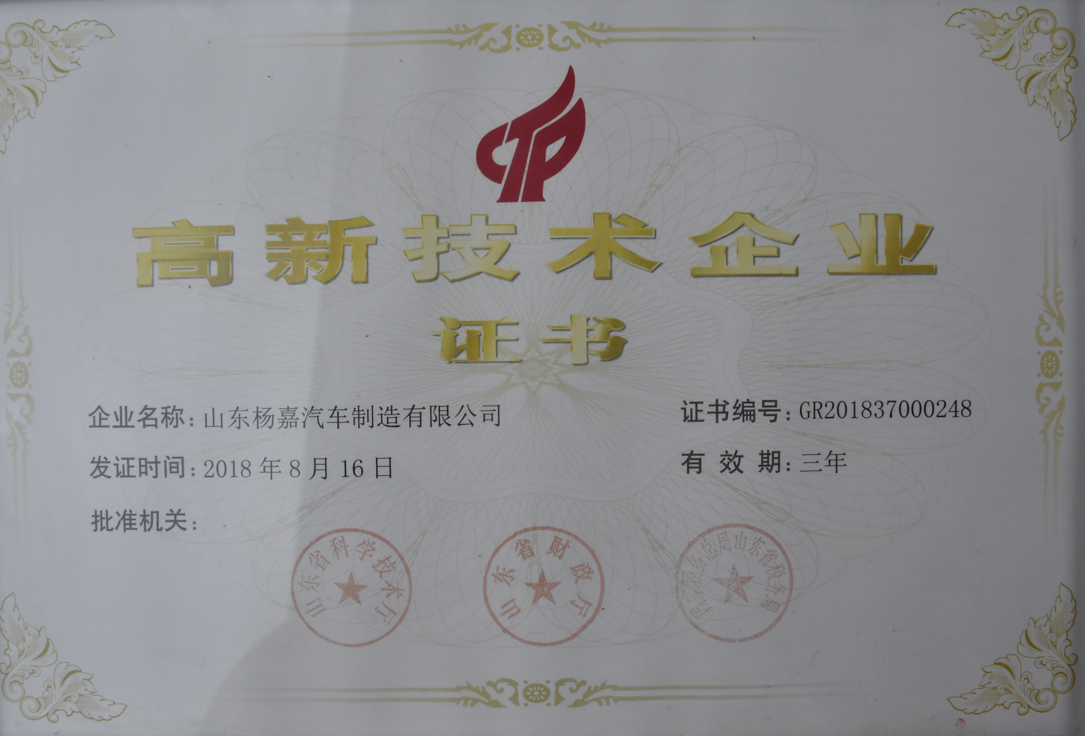 公司通过了“3C”强制性产品质量认证、ISO9001质量管理体系认证、ISO14001环境管理体系认证和OHSAS18000职业健康安全管理体系 认证;公司荣获山东省“守合同 重信用”单位、市级工程技术研究中心、省级“一企一技术”企业,“杨嘉牌”先后荣获山东省著名商标、山东名牌产品、国家级专精特新“小巨人”企业、山东省单项冠军企业。