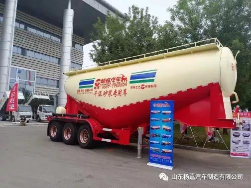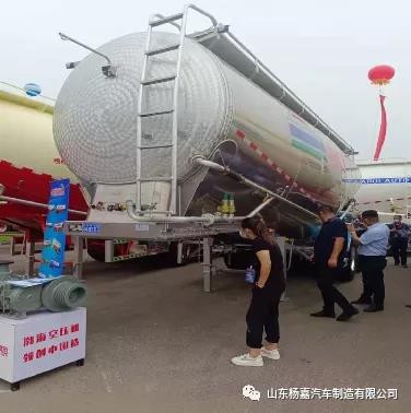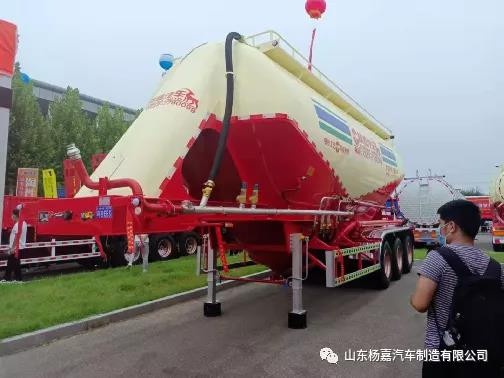 杨嘉汽车近年推出的主导产品之一——铝合金粉粒物料半挂车深受市场欢迎,具有5大特点:(1)高承载(纵梁采用T型梁,承载力可增加3~5倍)。 (2)高经济(采用符合欧标的板材,轻1.5 t;同时使用寿命长,一般15~20年,而钢罐寿命只有7~9年,且期满后残值比钢罐车残值高约3万元)。(3)打灰快(铝合金表面光滑,卸料时间比普通 粉罐车快5~10min;剩余量少100 kg,接近“零残留”。同时,模块化供气管路+流线型出料系统+黄金流化角>15°,打灰比同行快10 min)。(4)双安全(低重心设计;罐体采用MIG/TIG焊接技术,一次成型;罐内采用多重防打爆技术;采用双安全气阀);(5)一罐多用(适用于散 装水泥、粉煤灰、钙粉等多种介质运输)。